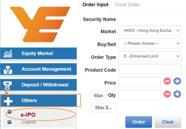 Log onto Online Securities Trading platform (https://trade.yxsh.hk/mts.web/Web2/login/yxs/index.html#eng) and click “e-IPO” on the “others” menu.