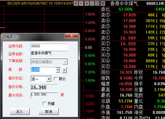 在行情报价窗口激活时,输入港股股票代码,行情窗口显示股票的分时图或者K线图界面,按下以下热键会自动带价带量进入委托状态: